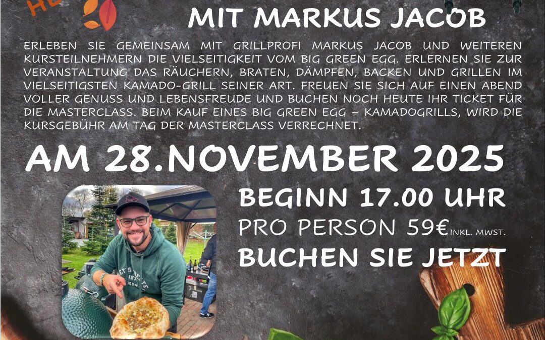Der Flyer bewirbt ein Grillevent, bei dem Grillprofi Markus Jacob die Vielseitigkeit des Big Green Egg Kamado-Grills vorführt. Teilnehmer lernen Räuchern, Braten, Dämpfen, Backen und Grillen kennen. Ein Foto zeigt Markus Jacob lächelnd beim Grillen, daneben frische Kräuter, Pfefferkörner, ein Mörser mit Basilikum und ein Big Green Egg Grill. Besonderheit: Beim Kauf eines Big Green Egg am Veranstaltungstag wird die Kursgebühr verrechnet. Anmeldung per E-Mail oder vor Ort im Küchenhaus Arnstadt.